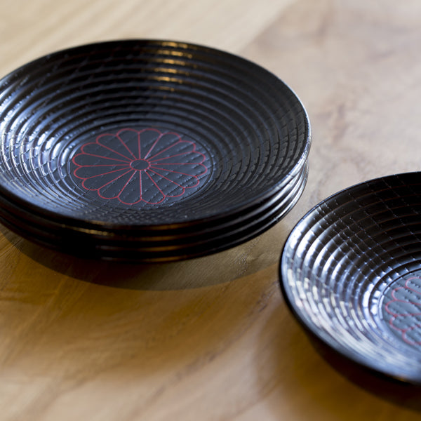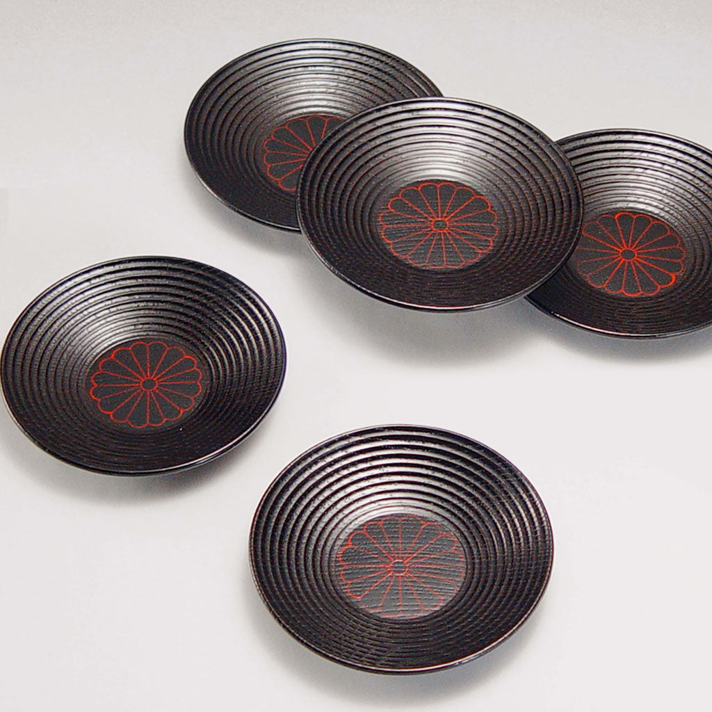 This elegant set of five saucers has a simple chrysanthemum pattern.