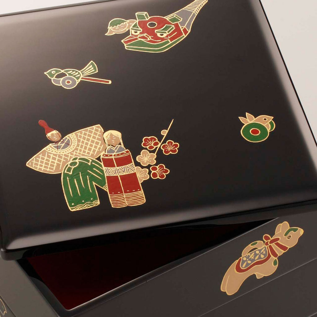 Lacquer paintings of adorable toys scattered on the lacquered surface will add a festive color to your New Year's table.