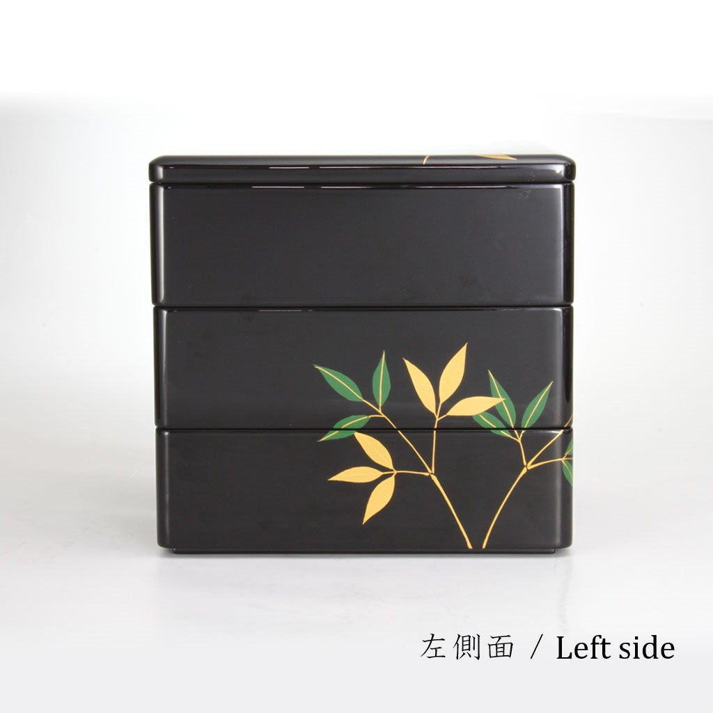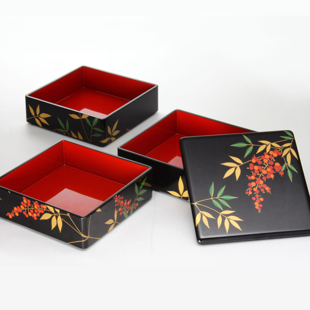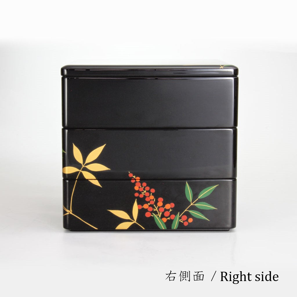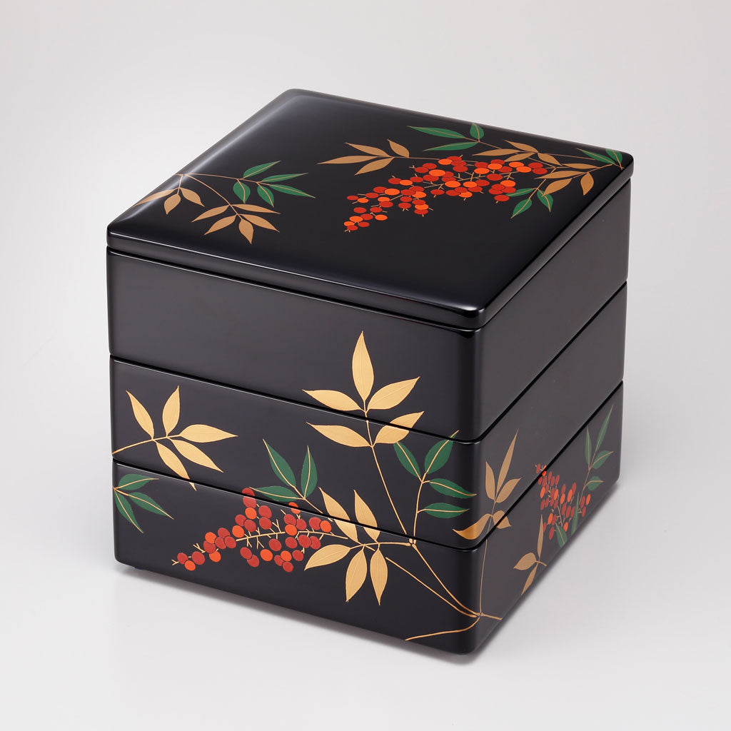 The outside is painted with black lacquer, and the nanten tree is depicted in bright maki-e on the top, front, left, and right sides.