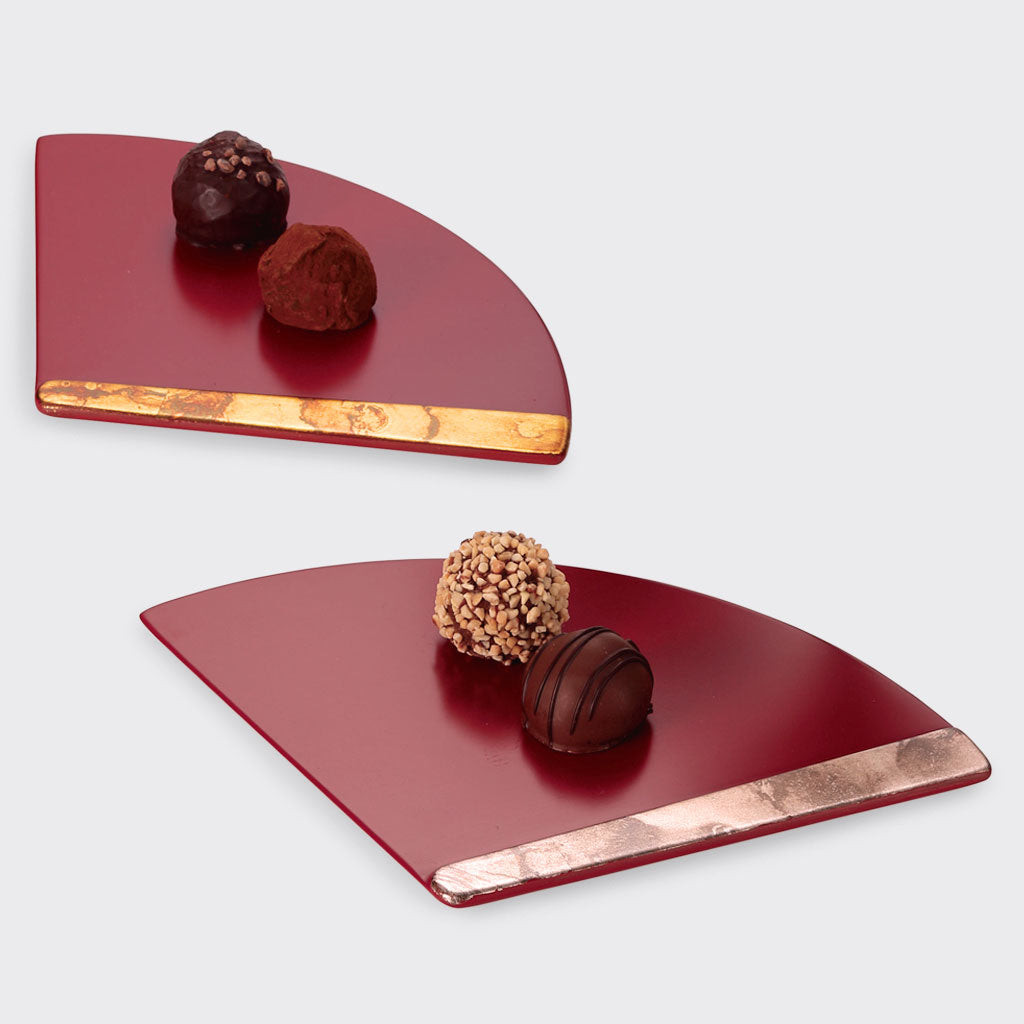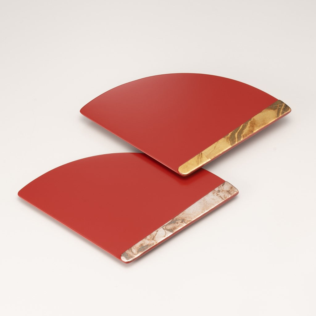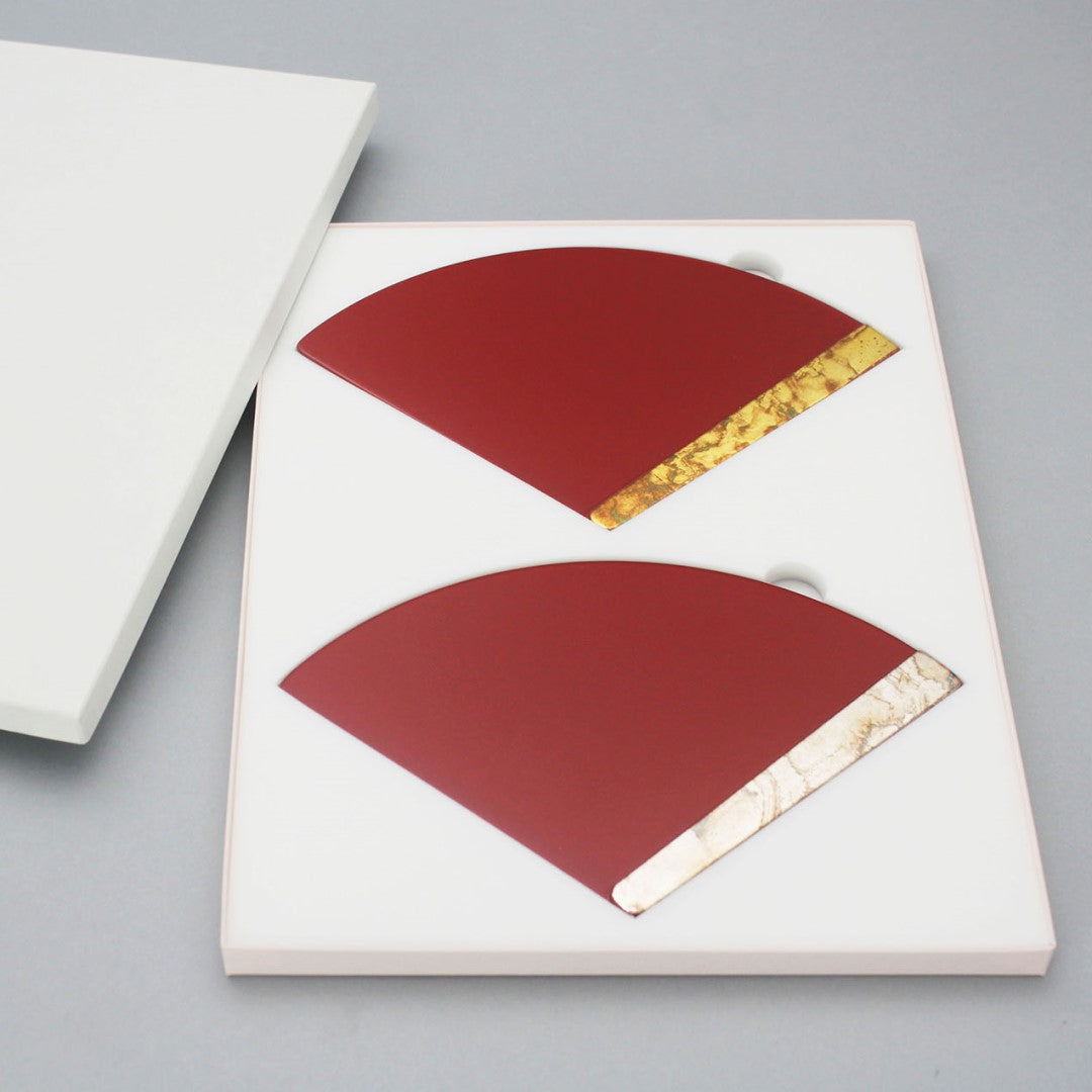 A set of plates with gold and silver foil accented in the shape of a fan that spreads out and is auspicious.